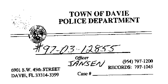 Davie Police Officer Gregory Jansen was dispatched when Plaintiffs tried to run over the defendant with their car. The Defendant was an FBI Informant/Witness against them, and the former owner of the property, a deported Columbian Alien.Jansen's Police Report was scheduled to be used in a trial against Plaintiffs Scott Bagwell and Cindy Gregory, but guess what?