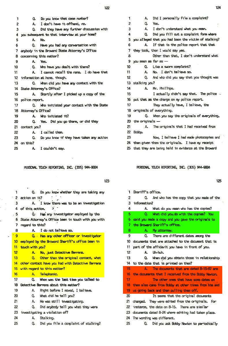 Plaintiff Cindy Carol Gregory swears under oath in deposition that she had no contact with Broward Sheriff's Detective John Berrena (area in yellow), so how did he end up with property from her that he withheld for 2-1/2 years until after this trial........